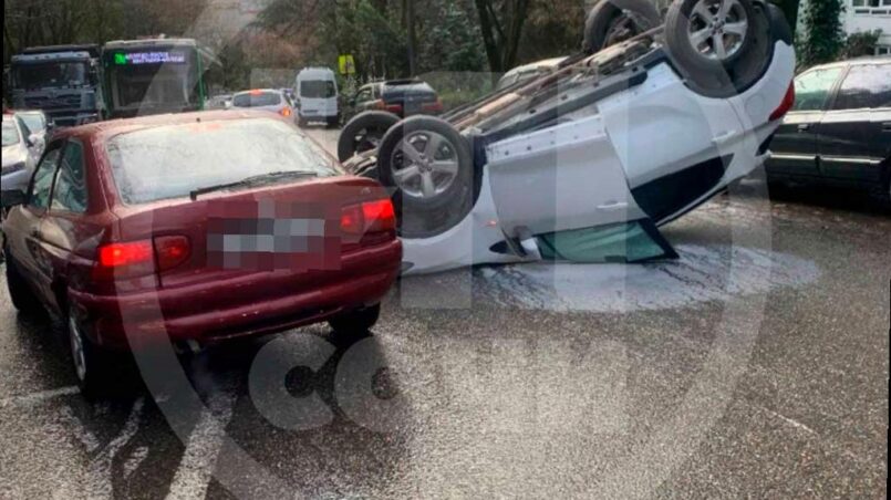 Сегодня днем в Центральном районе Сочи на улице Макаренко случилось необычное происшествие. На крыше легковушки оказался перевернутый автомобиль, как показали кадры, опубликованные в телеграм-канале «ЧП Сочи».